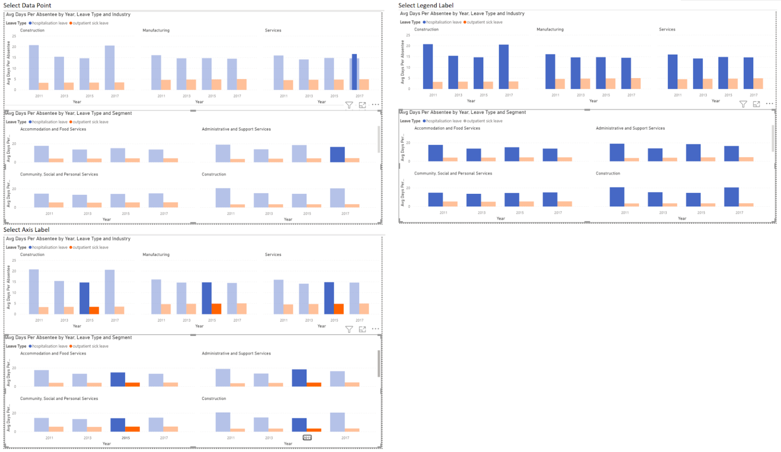 Small multiples behave like their own visualizations if you select an individual data point. However, you have the added benefit of treating them as a group. To do this, click on an item in the legend or a label in the x axis. Note how the cross filtering of other visuals changes: